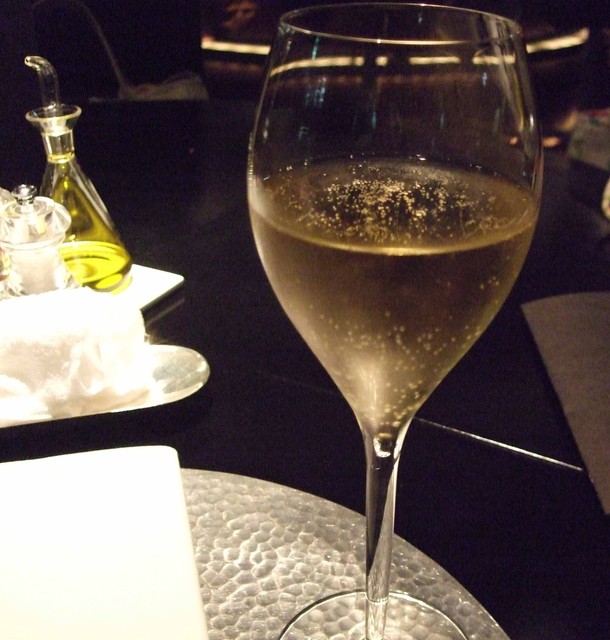 飲み物は?と聞かれ、まずはグラスのスパークリングワインを頼むと、2種類あり、1000円と1500円で、1500円のものはヴィンテージものでお徳と。もちろん従う。