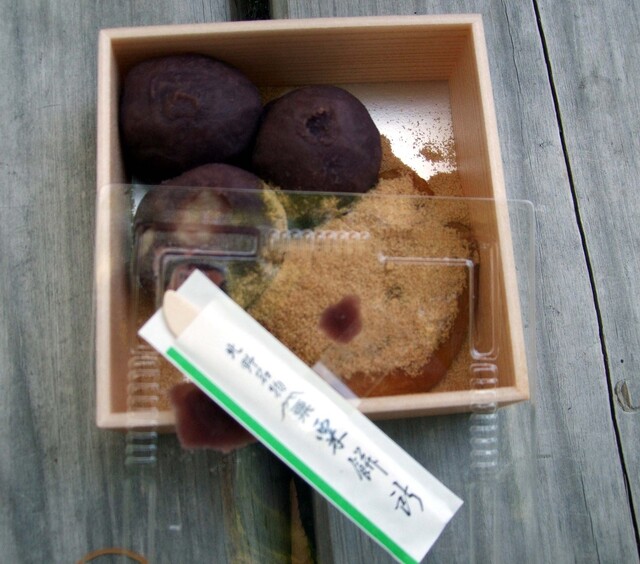 すると、やにわにご主人がお餅をちぎって丸めて出し、あんこでくるんでおりに入れてくれる。そしてその横で、奥さんがご主人がちぎって小判状になったお餅にきな粉をかけてくれる。