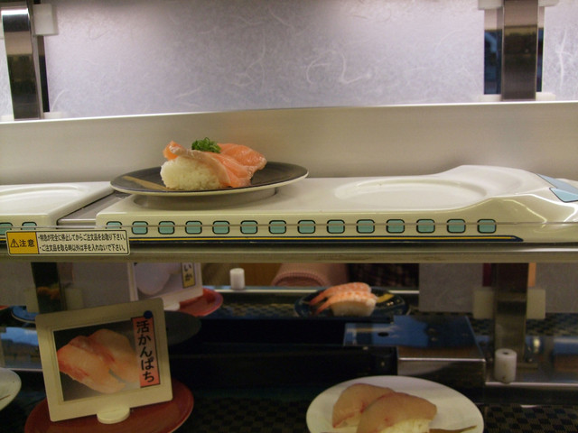 おお、ベルトの上の段の特急レーンに新幹線に似せた台車に乗って注文した寿司が運ばれてくる。楽しいゾ~。