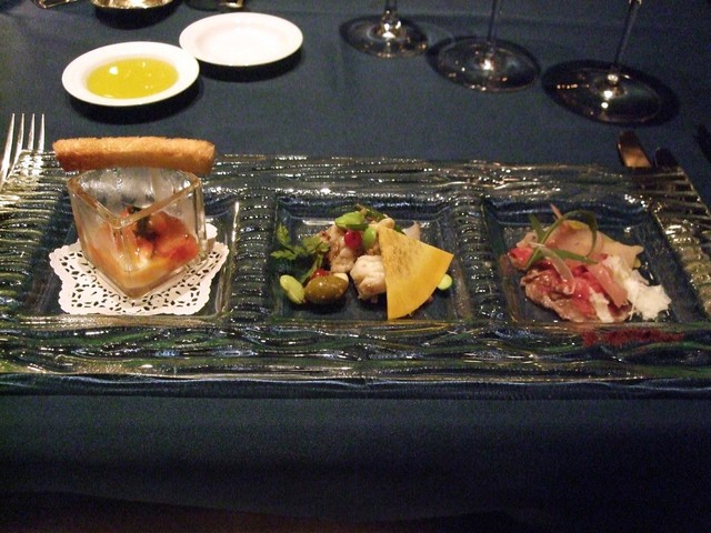 続いては3種のオードブル。野菜のマリネ、肉のたたきなど。やや塩味が強い。