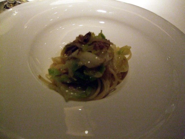 パスタはアーリオ・オーリオ・ペペロンチーノ。なんとイワシではなくサバを使用している。サバの匂いを消すためにレモン汁が多い目に使用されている。これ、意外とくせになりそうな風変わりな味。