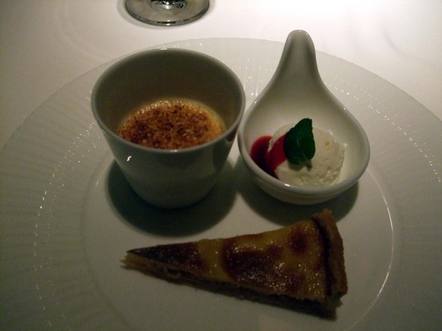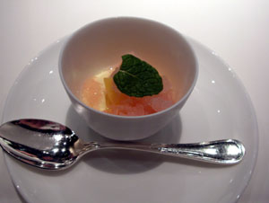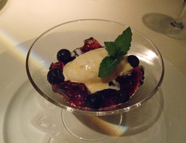 肉料理は”仔牛ロース肉のスモークチーズのせ リヨン風ソースと新玉葱のグリル添え”。タンポポの葉が面白い。肉はまるでボンレスハムのように燻製したような味。しかし、風味の強いブルーチーズを乗せて焼いているだけだそうだ。すごいテクニックに脱帽。しかし、やや懲りすぎで、本来の柔らかな仔牛肉が死んでいる。惜しい。