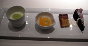 極めつけは本日のデザート。キハチのロールケーキ、ガトーショコラ。中にピスタチオの入った木苺のトルテ、青りんごのすり実がのったブラマンジェ、グレープフルーツのコンポート、桜のゼリー。全種類を頼んでもいいとのことで、もちろんすべてをいただく。どれも最高に美味しいが、ロールケーキが最高。大阪ではキハチのケーキは販売しておらず、食べることができるのはレストランのみ。以前は販売していたのだが、あまり人気が出なくて撤退したのだとか。ハーブティーはレモングラス、ミント、レモンバーム。