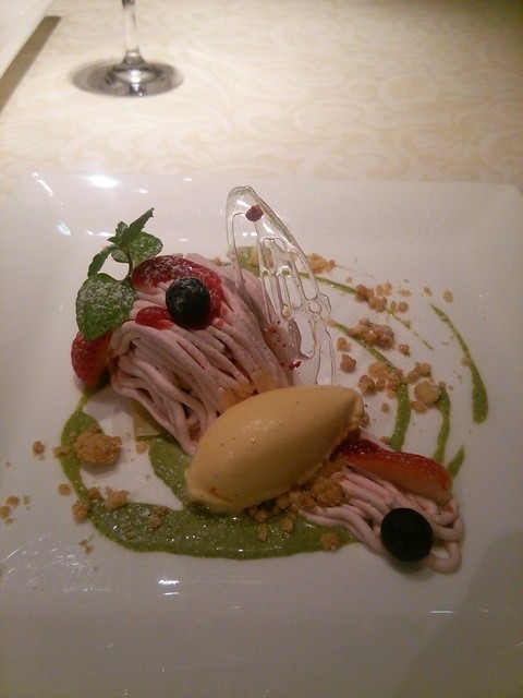 デザートは、苺を纏ったシャンパンムースのモンブラン仕立て 赤と緑の2色ソース