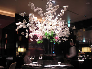 桜の季節。Dinner Course B ~関西の春野菜を味わう~をいただいた。店内には立派な桜が。相変わらずバックグランドミュージックは大きく、大きな声での会話が必要。一番奥の席に案内された。