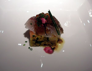 前菜はの1品目は”明石産桜鯛のたたき風とお米のサラダ”。もち米のサフランライスに桜の花の塩漬けやマスタードが混ぜてある。桜の花に桜鯛とは粋なシャレ。和食とスペイン料理のコラボ。
