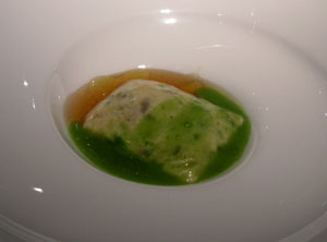 2品目は”ずわい蟹と汲み上げ湯葉のムースリーヌ グリーンピースの鶯餡仕立て”。和食である。鶯あんとコンソメあんのバランスが絶妙の逸品。