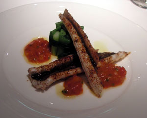 3品目は”明石産穴子のグリル 関西焼き風 緑色の野菜メダルとピリ辛サルサ”。ピリ辛のソースを癒すためにイクラや野菜を食べる。串かつとキャベツの発想。