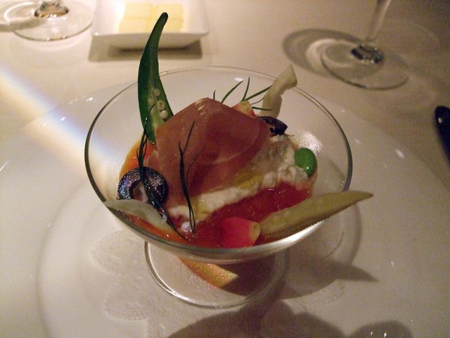 いつものごとく稲垣ソムリエがしゃれたスパークリングと白ワインをサーブしてくれる。どうしてこんなに持ち合せがあるんだって感じだが、平然とサーブしていく。恐れ入ります。