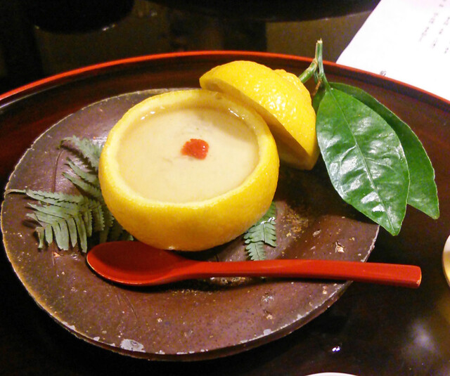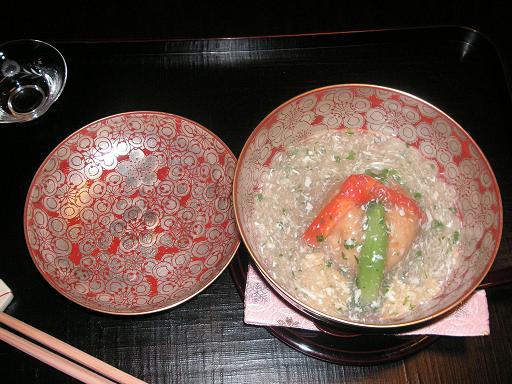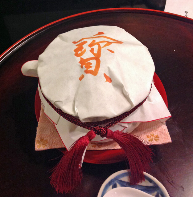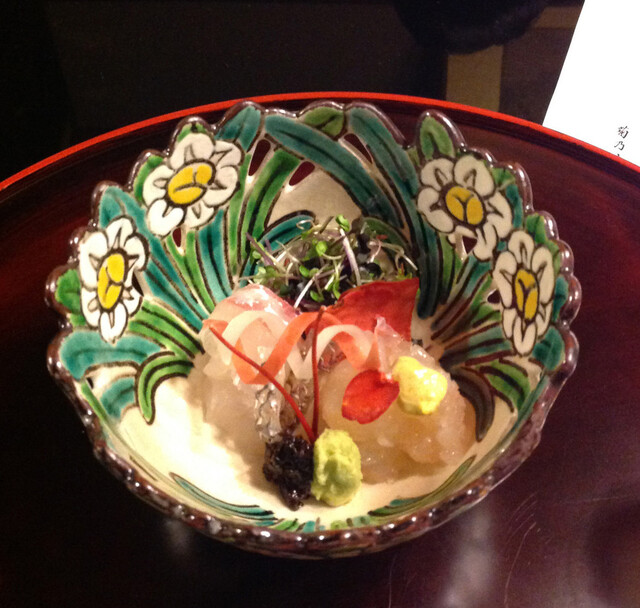 妻の誕生日に菊乃井を訪れた。道中の看板には料亭旅館とある。泊まれるのか。(後で教えていただいたのだが、昨年末までは泊まれたのだが、今年から宿泊は辞めたと。)狭い道を下ると突然に店先の広い庭が開ける。竹の風情がいい。玄関先にはいわゆる下足人のおじさんが。きれいな京都弁で話しかけてくれる。看板のところで記念撮影を。玄関で靴を脱ぎ、きれいで若いがしっかりしてそうな仲居さんに案内され店内に。廊下も狭く天井も低い。まさしく昔の旅館って感じ。う?!何やら賑やかな女性の笑い声が。場違いな感じだが、緊張していた私をリラックスさせてくれる。でもこんな超高級料亭で?ナゾである。後で女将さんに尋ねると、社員旅行を辞めて食事に来た若い女性の団体とか。やるなあ。最初にお抹茶と饅頭が。瓢亭同様、どこか有名な老舗のお饅頭かと思いきや、お店で作っていると。いきなり出鼻をくじかれた。なんとお店から妻の祝いの膳が。赤飯となます。大根と人参だけなのに実に美味しい。酢が絶品なのだ。椀物はなまことコノワタのお汁。生姜の味が最高。先付けはすし、くきわさび、丹波黒豆、白魚、菜の花、はんぺん等。お節の様でもちろんすべてが絶妙。絵馬風の器もオシャレ。お造りは海老と鯛。瀬戸内海の鯛と。この鯛、今まで食べた鯛の中でも一、二を争うほど美味しい。たかが造りなのに感激している自分が悔しい。トロは特製の黄身しょう油で食べる。トロはもちろん上物だが、この黄身しょう油、ご飯にかけて食べたら美味しいだろうな。女将さんにそのことを言ったら、女将さんもご主人に同じことを言われたと。百合根饅頭。なんと中身はフォアグラ。和洋折衷で美味しいのは無論だが、この器。外観は紺色で地味だが、蓋をあけると梅の紋が一面に。華やかである。そして梅の紋の中に1ヶだけ桜の紋が入っている。それも浮かしで。すごい隠し技。女将さんもお気に入りの器と。焼き物はまなかつおの香草焼き。添えてある柚子の甘露煮が美味しかった。お口直しは、お造りででてきた海老の頭で作ったスープ。伊勢海老のスープみたい。続いて、蓋に細かな水滴がついた玉手箱が出てきた。何でだろうと思っていたら、仲居さん曰く”誰も蓋を開けていません”という証で霧吹きで吹くのだと。なるほどなあ。中身はまるで八寸様。鱈の白子、鮑、百合根といくら、ぬたあえ、フォアグラと奈良漬、からすみ。いやまいった。みんな素晴らしく美味しい。続くはなんとすっぽん鍋。菊乃井ですっぽんを食べるとは思わなかった。中にふかひれと九条ねぎ。コラーゲン攻撃だ。最後はあなご飯とかす汁。お米はもち米だから、もうお腹いっぱい。デザートはヨーグルトシャーベットと苺のゼリー。アルコールに関して最初はプレミアムモルツだったが、やはり日本酒が合うと考え、菊乃井特選の甘口と辛口をいただいた。辛口といってもそれほどの辛口ではなく、まさしく料理を引き立てる味で嫌味がない。それにしてもまあよくもこれだけ予想を覆されたことか。瓢亭が昔からのオーソドックスな内容だったから、菊乃井も同様と思い込んでいただけにびっくり。フランス料理の雰囲気があり、ヤポニズムって感じ。瓢亭が東の横綱なら、こちらは西の横綱である。思うに、リピーターが多いから、直球勝負では持たないのであろうか。女将さんも、瓢亭は厳格な感じの方だったが、菊乃井の女将さんは話上手で人なつっこい感じ。食事中に部屋にご挨拶に来てくれ、約15分くらいだろうかお話させていただき、大変楽しかった。そして、お店を去る時は玄関で三つ指ついてお見送りをしていただくなど、気配りはすごい、いや、すさまじい。やはり人気が高いにはそれなりの理由があります。また是非とも訪れたいお店です。でも、サイフの関係上、次回はいつのことやら。