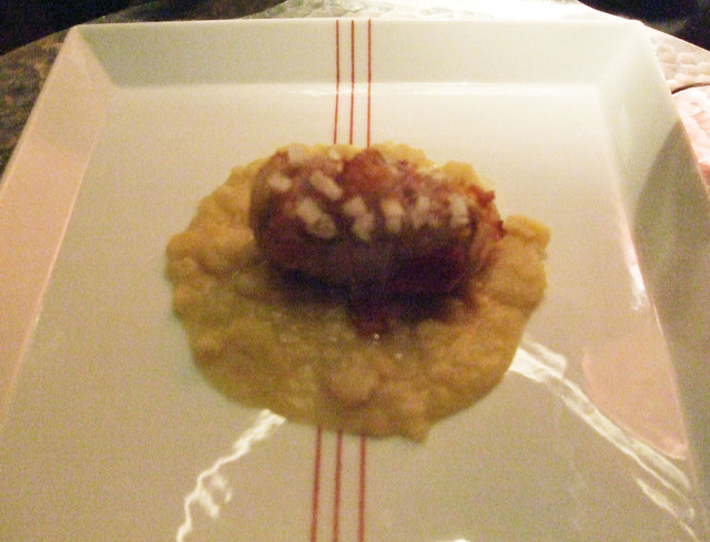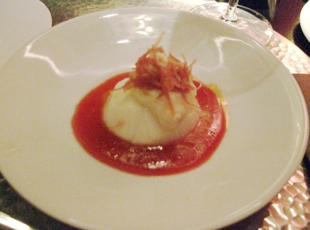 サンマのマリネとオクラ。 タルタルとボッタルガソース。 ずばり和食である。サンマはパスタのように細い。もう少し食べ応えのあるくらいの太さがいいなあ。