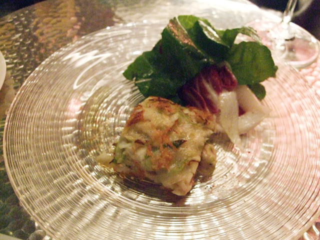 飲み物は?と聞かれ、まずはグラスのスパークリングワインを頼むと、2種類あり、1000円と1500円で、1500円のものはヴィンテージものでお徳と。もちろん従う。
