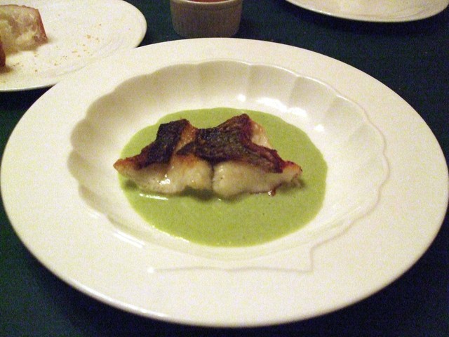魚料理はスズキのポアレ。しかし、見事に皮が焦げている。おいおい、プロなのにしっかりしてよと思いながら食べると、このおこげがパリパリして美味しい。グリンピースのソースによく合う。おかしいなあ。