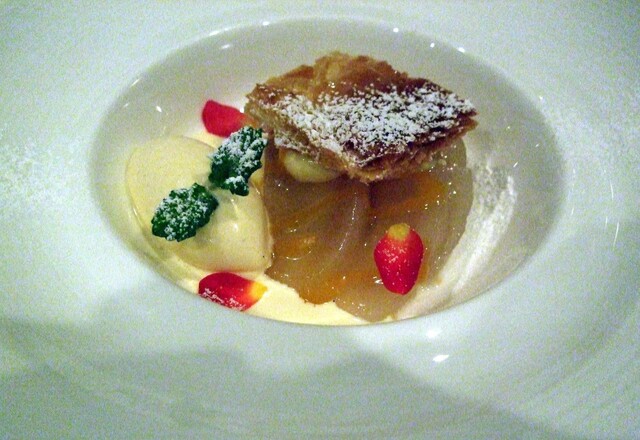 2品目は洋ナシのミルフィーユ バニラアイス添え。焼きたてのミルフィーユはパリパリで美味しい。すばらしい逸品である。