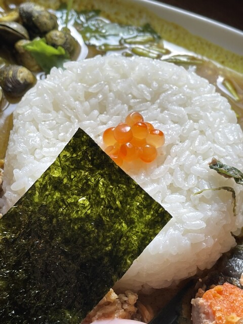 今回の新作カレーは、「骨付き豚カレーといかキーマ(オリーブ入り)揚げ芋にギリシャクリームのせてる。」です
