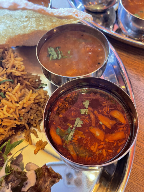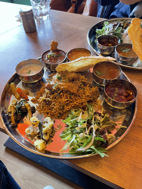 今回は、チキンビリヤニセットにハーフマサラドーサを付けて、ドリンクはホットチャイを選びました