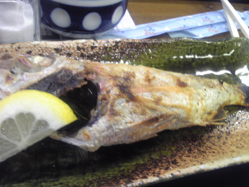という事で、カウンターの上にあった焼いてあったマグロのカマをつまみにもらいました。