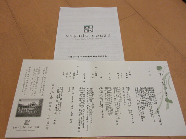 夕食は2階の半個室でした。おしながきの他に「湯宿草菴特別和食膳料理解説読本」という冊子まであります。