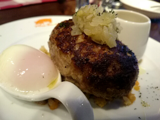 パテの下にはレンズ豆、無料でついてくる温泉卵にたっぷりかけれる柚子胡椒ソース