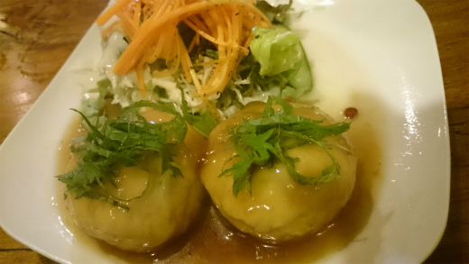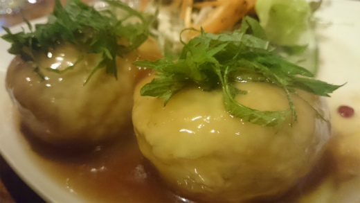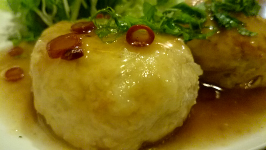 出汁が聞いてる和風ソースに豆腐と鶏肉のヘルシーなパテ