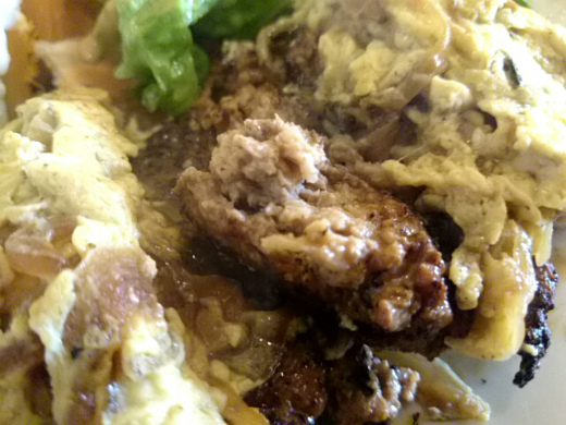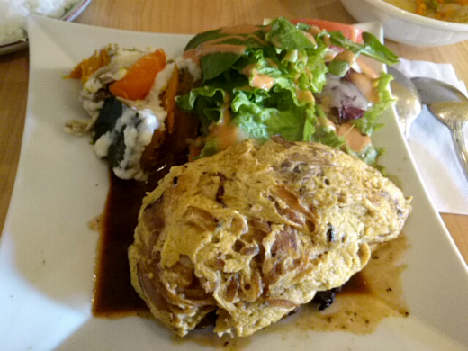ふわっとしたオムレツの中にぎゅっとしまった食感のハンバーグ