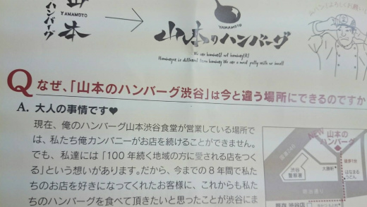 JUGEMテーマ:ハンバーグ昨日、俺のハンバーグ山本改め山本のハンバーグに行ってきました。山本のハンバーグは俺のハンバーグから卒業したとの事で、今ある俺のハンバーグは俺のハンバーグ山本とは関係無いそうです。ややこしいですね(*´ω`)とりあえず、昔からハンバーグ界の歴史を築いていた店は山本のハンバーグという店だと言う事であってると思います。そして夜ハンバーグです夜の渋谷はあまり来ないので歩道橋から一枚何か、ちゃんとした写真載せるとちゃんとしたブログみたいですね(笑)お店に向う途中、明治通り沿いに俺のハンバーグ シュシュ渡辺つまり、俺のハンバーグって言うのが・・・めんどくさくなってきたから省略です今日はこちらではなく本家本筋山本のハンバーグです渋谷の老舗洋食レストラン能代があった場所のすぐ近くです。オッサレー!何これオッサレー!!(ヒャッフーおこちゃま今回はゲストさんと入店するのでオサレな店でも大丈夫です(*´ω`)程なくしてゲストさん登場!そして入店店内もオッサーレー!!!カウンターとテーブル席があり、昔ほど多くない席数ですが店員さん一人一人の接客対応がもの凄く丁寧で驚きました、オサレです。メニューは冊子です(笑)実はこれ、持って帰っても良いメニュー冊子なんですなので持って帰ってきました中は・・・今回の流れもきちんと書いてあってわかりやすいですね・・・・・・・・・・・・ん?んん??なんぞこれ(゜д゜)!?大人の事情ですって何(;´Д`)!?何だか黒い大人の話の香りがするわ・・・深く入ると怖いから見なかった事にして注文はふんわりハンバーグ ¥1200俺はダブル ¥600ゲストさんが地鶏の夏野菜たっぷり!!冷製坦々ハンバーグ ¥値段わすれた俺はダブルとは、パテがもう一個増やせる食いしん坊の為のメニューです何故それを頼んだかと言うと、山本さんの所は粗引きと細引きのパテがありどっちも個性があって美味しいので折角だからどっちも楽しんできました+。:.゜ヽ(*´∀`)ノ゜.:。+゜そのダブルハンバーグがこちら片方は細引き、片方が粗引き細引きのほうはふんわりタイプのパテに肉汁がじわじわ出きってしまう事もなく最後までジューシーさが保ってあるので優しいです(*´ω`)もう片方は全然違う粗引きもきゅもきゅっとした強い食感のパテは肉くってるな!って感じになります。ゲストさんが頼んだ地鶏の夏野菜たっぷり!!冷製坦々ハンバーグそう!冷製です!冷たいんです!!!冷たいハンバーグなんです!!!多分これ見た人の感想の数十倍おこちゃまは心の中でディスってました(笑)普通に、え?コレネタでしょ?(*´ω`)?てしか思ってなかったんですが美味いのよ鶏肉と軟骨、そのほか色んな工夫がされてるのがわかるパテネタとか思っててマジすんませんそして、あぁ食べてて良かった、コレを食べないまま過ごすのは人生において実にもったいないと本当に思いました。コレ完成するまで相当がんばったんだろうなぁ美味しいし、”面白い”じゃなくて”美味しい”って人に勧めれるもんなぁちなみに美味しくなかったら自分のハンバーグだけ載せる予定でしたんで(割と平気でそう言う事する可愛い性格)人の好みもあるかと思いますが、美味しかったです!あ、ただ肉!!って感じは無論しませんので肉!!が良い人は粗引きをWにしたりするのをおススメします(笑):おこちゃま一言メモ:ちなみにゲストは山本社長でした(笑)