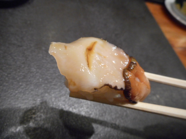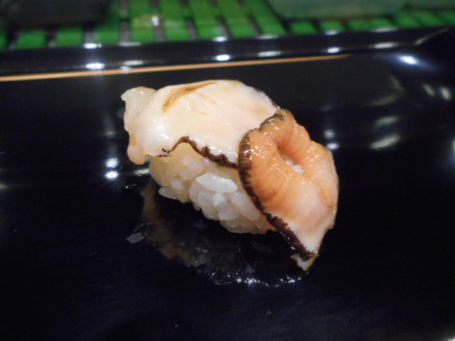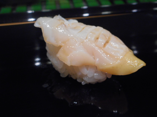 バイ貝。隠し包丁が入っていて、更に包丁の背中でタタタンタンと叩かれることによって
