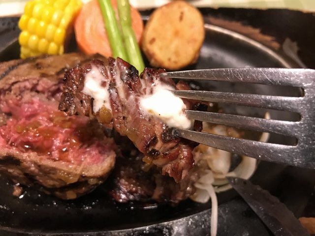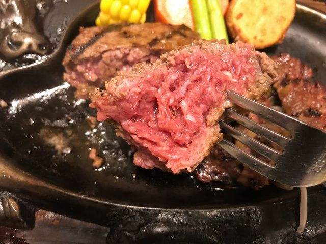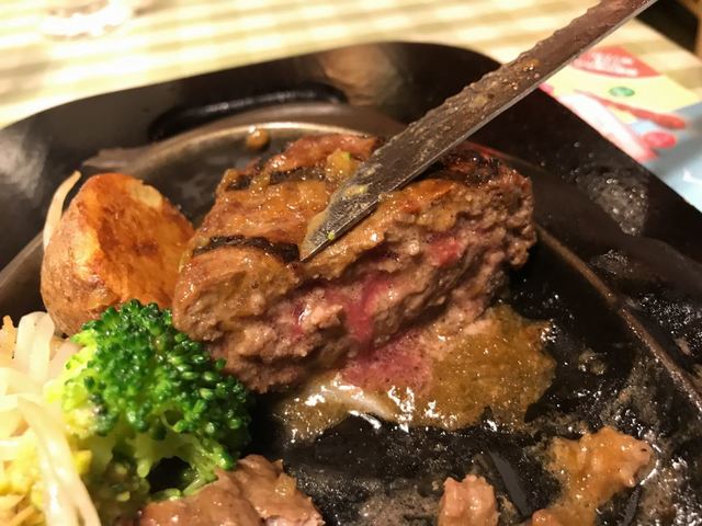 スタッフがハンバーグを切ってくれて、赤いところをステーキ皿に押し付けてじゅーっ!と言わせてから食べるんです。