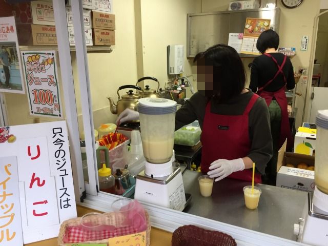 ちゃんとジュースにする直前にその場で、人の手で皮をむいてます。