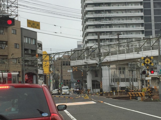この、悪魔のように長い踏切を渡ってすぐの大きな交差点の近く。