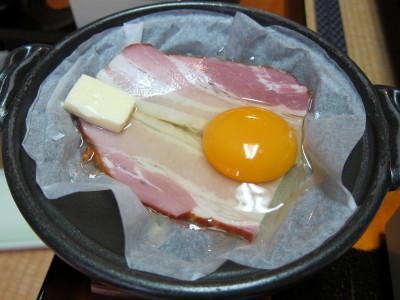 1人用コンロの上の陶板には、ベーコンの上に生卵とバター。