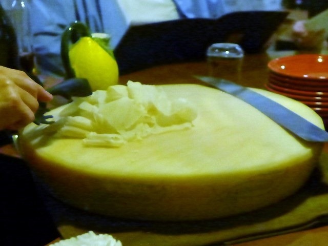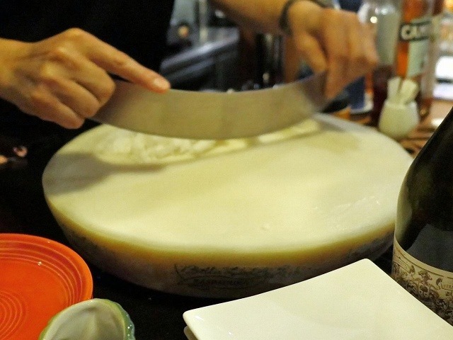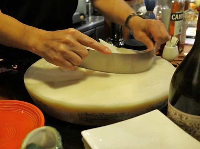 目の前で大きなチーズの塊から削り出してくれます。