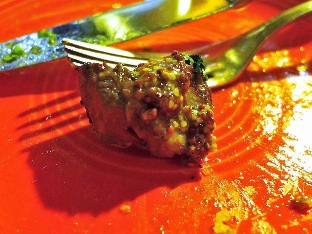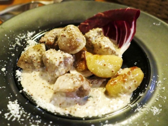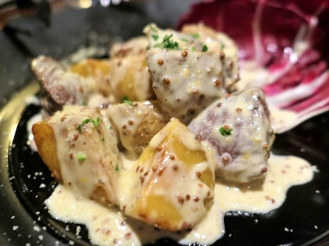 ひと口大の肉とジャガイモ。粒マスタードのクリームソースがすごく旨いんです。