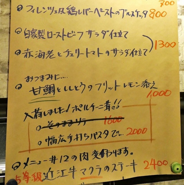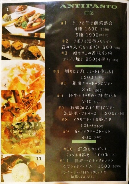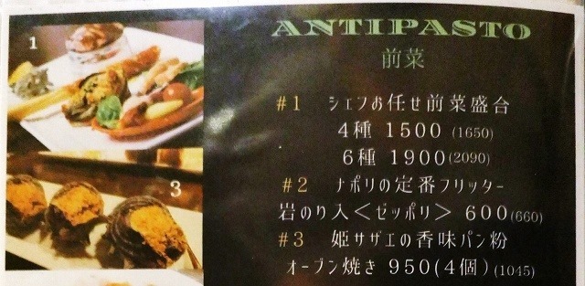 ここに書かれた料理のいくつかが前菜盛合で出されるんです。