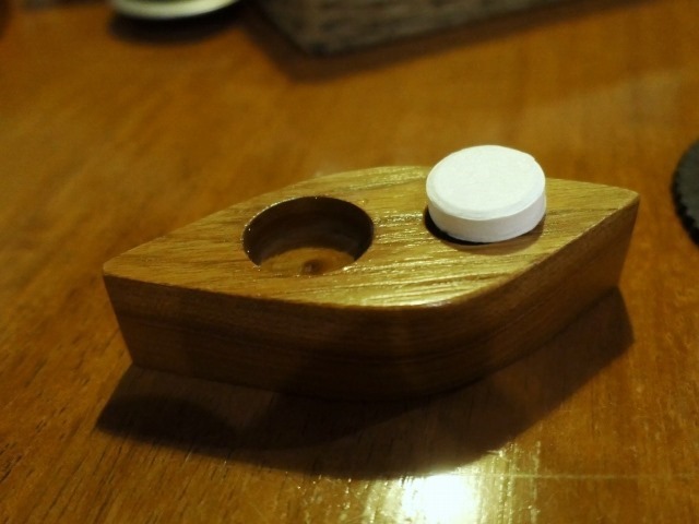 木製の台にあいた2つの穴に、1つは丸いタブレット、もう1つは水が入ってる。