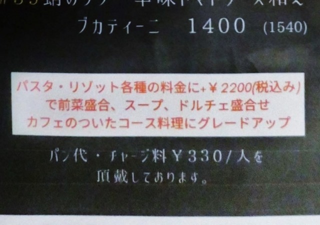 パスタ・リゾットに+2,200円で、前菜盛合、スープ、ドルチェがつく、というセットです。
