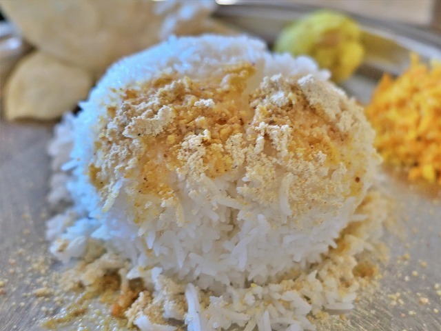 その上に11.ギー&ホディがかけてある。ギーは澄ましバターで、バターの香りが立ち上がる。ホディは、豆とスパイスのふりかけ。