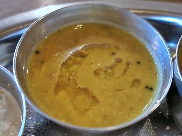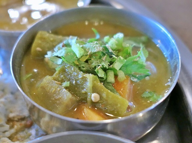 6.サンバル。南インドを代表する豆と野菜の煮込みカレー。タマリンドが入って酸っぱ辛い。