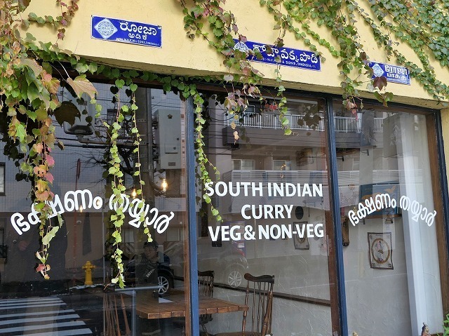 大きな窓に英語で「SOUTHINDIANCURRYVEG&NON-VEG」(南インドカレーベジ&ノンベジ)。