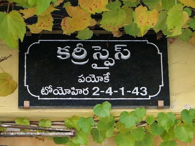 ドアの上にある看板はテルグ語で「కర్రీస్పైస్ పయోకే」(カリースパイス・パヨカイ)と書いてある。