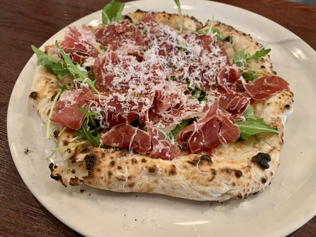 ピザは、シラスたっぷりのものに。オリーブとニンニク、もちもちの生地がよかった。