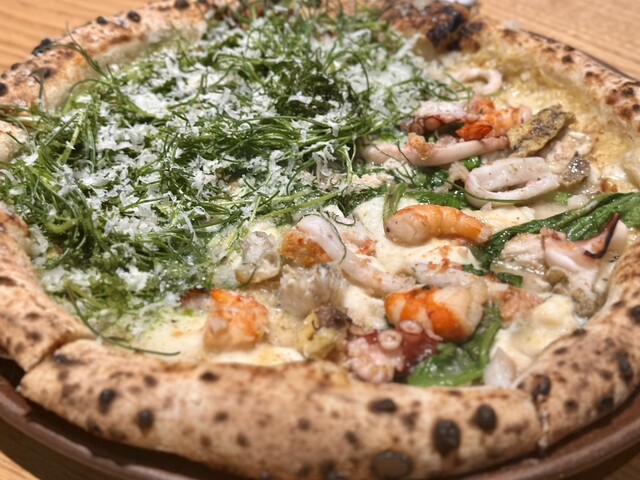 初挑戦は、ジェノベーゼ、マルゲリータベースの生ハムとブッラータとシーフードのハーフハーフ。