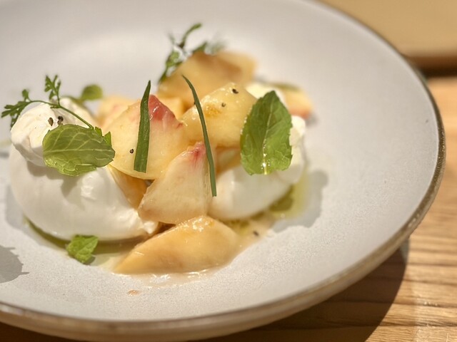 フルーツマリネとルカブッラータのフルーツは、桃、柿、枇杷など、季節によって変わる。