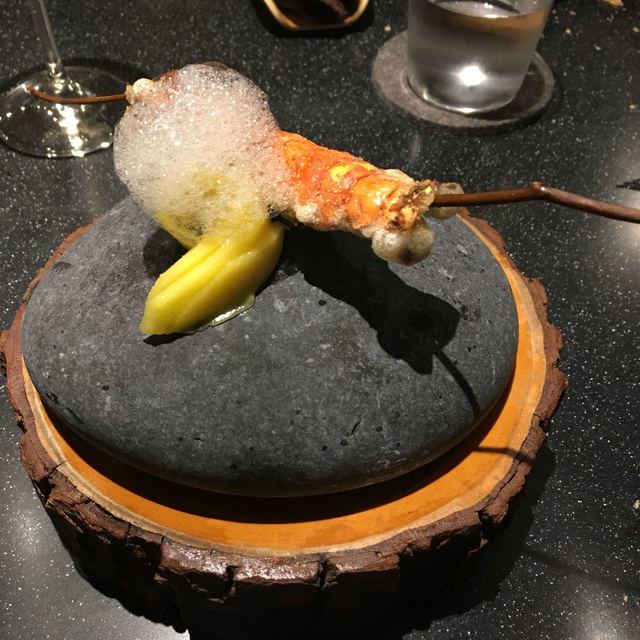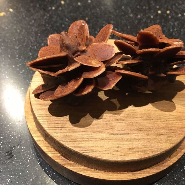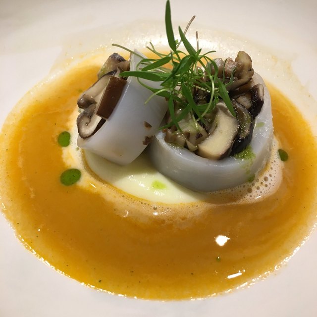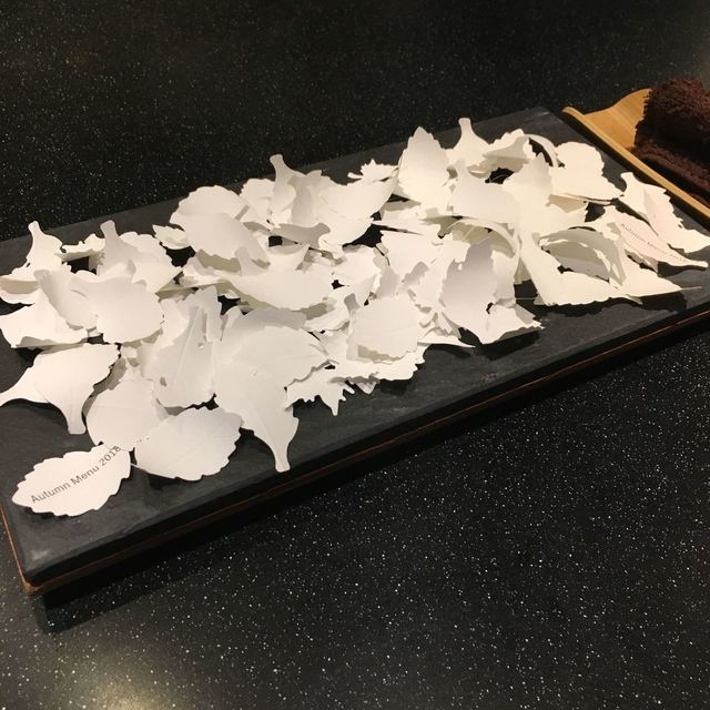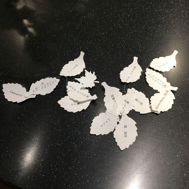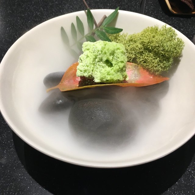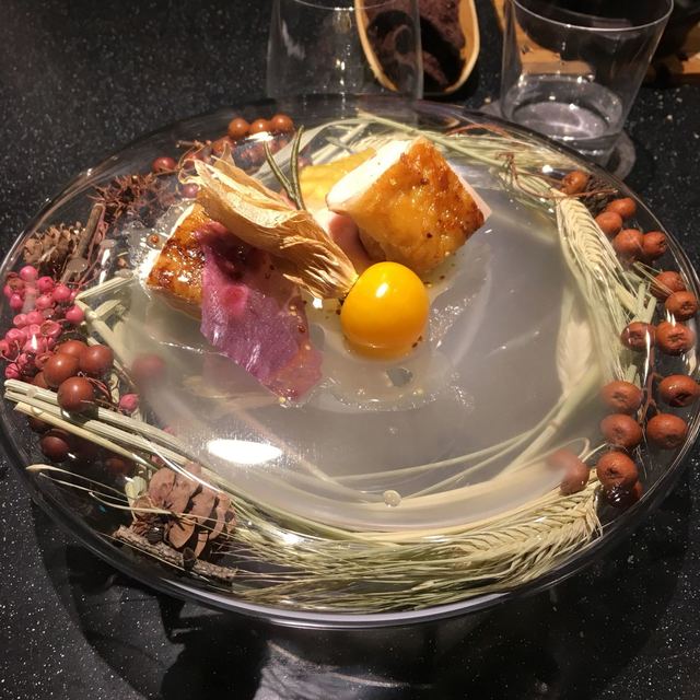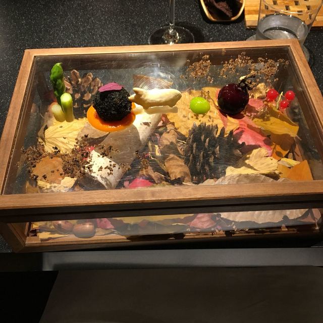 モダンガストロノミー。写真を見て貰えばわかるがとにかく凝ってる。今回は秋のメニュー(3ヶ月毎にメニューは変わる) 色々な旬の食材が登場する。様々な調理法で調理される。パンも美味しい。カウンターだったのだが、料理するのを見てるだけでワクワクした。こだわりようはメニューが書かれた紙の葉っぱからも伝わってくる。