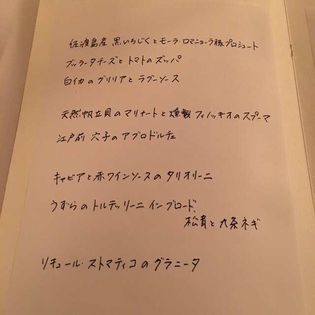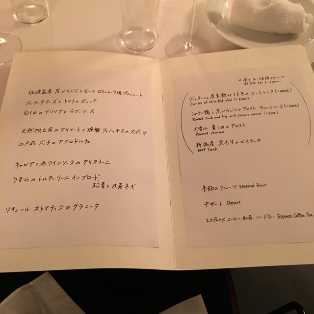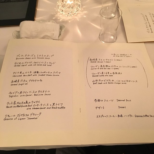 感動。悶絶。発狂。個人的にはもう出てきたの全部アミューズからドルチェまで大好きだった。一番興奮したのは、キャビアと赤ワインソースのタリオリーニ。ランド産ホロホロ鳥のラビオリもファイヤー。ドルチェは必ず1000円プラスしてクレマカタラーナと白トリュフは食べたほうがいい。後、パンも美味しい。ボトルのワインリストもやばい。