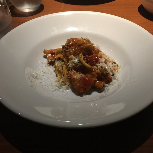 『完熟トマト パンチェッタ 卵黄で和えたトンナレッリ』前回も食べたけど美味しい。