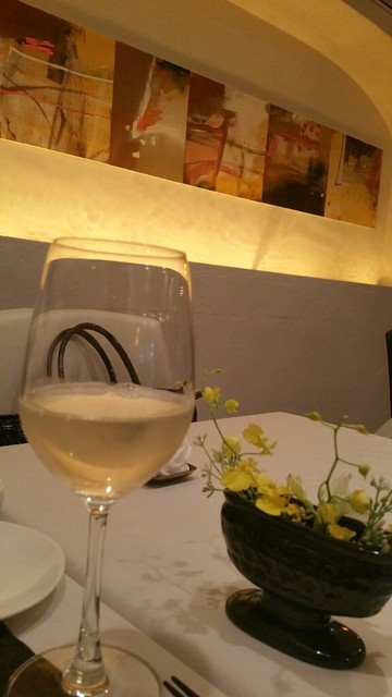 地下を下りると、こじんまりとした清潔感溢れる店内。ハープシコードのBGMが流れる。テーブルには黄色いオンシジュームの花が可愛い。