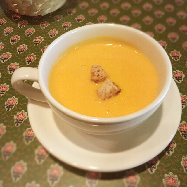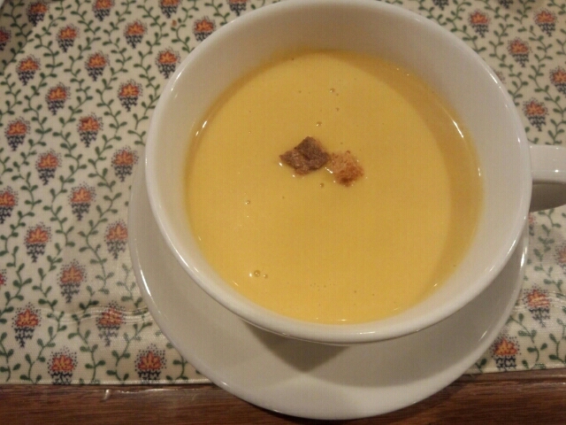 スープは彩々野菜のポタジエ色から想像して、コーンやカボチャのイメージですが、妻がひとこと「ほんま、野菜いろいろやわ」