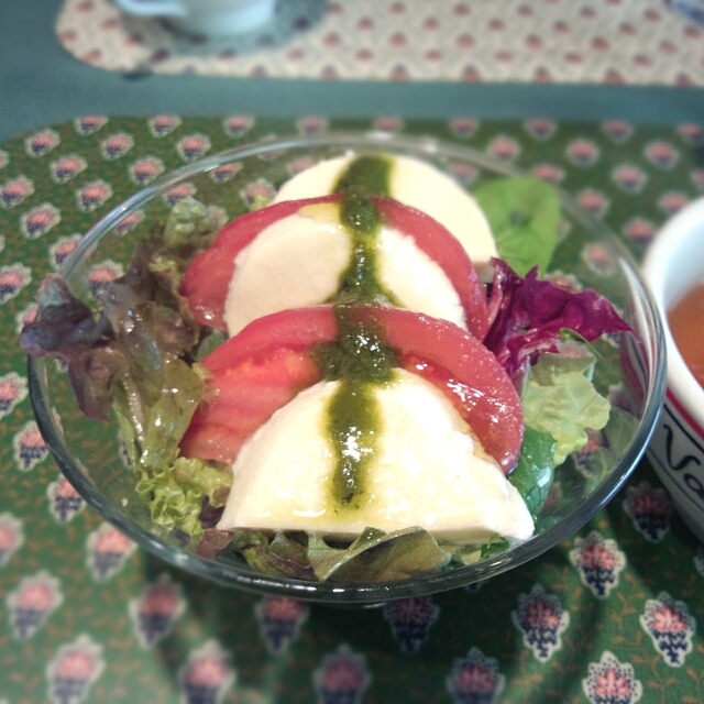 前菜は、モッツァレラとトマトにバジルソースをかけたカプレーゼ風。