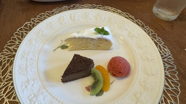 私はフルコースランチをいただく。前菜は万華鏡のように様々な味を楽しめた。白葱のスープは上半分にフォームミルクを浮かべて実に美味。タイのムニエルは皮がぱりっとして肉厚の身は酸味の効いたソースの旨味をしっかりまとう。ハンバーグの下にはたっぷりのマッシュポテト、一緒に口に運ぶと味わい深い。デザートはスフレチーズケーキ・ガトーショコラ・苺のシャーベットの取り合わせ。あー美味しかった、ごちそうさまでした。次は夜にお酒と共に愉しみたいな。